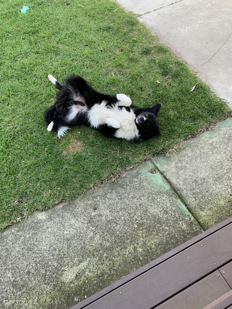 He rolls onto his back and tries to evade me.