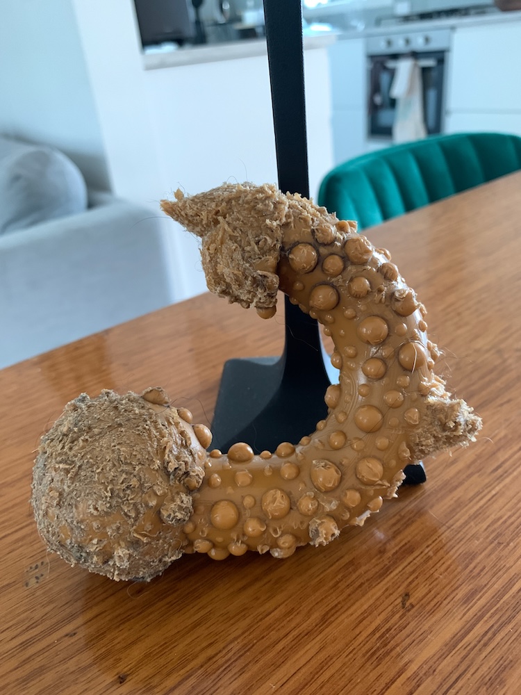 Lastly, there's his stick. This stick has been around for months. It was recommended to us by our friends Mara and Kallan who got it for their dog Jack Jack. It's meant to taste like peanut butter. I don't think there's a hint of flavour left. He chews this everyday for at least 20 minutes. He sometimes chews it first thing on our bed at 7AM. The chewing noise is very loud and annoying when we're still trying to sleep.