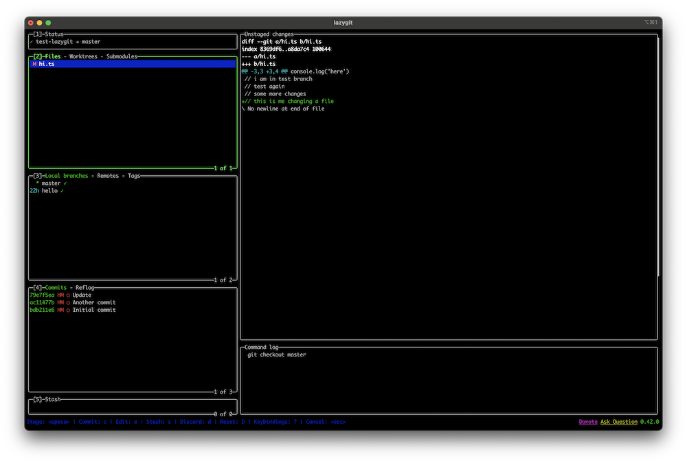 I've been very hesitant so far in my career to try any of the GUIs for git but lazygit has piqued my interest based on its simplicity and efficient key bindings.