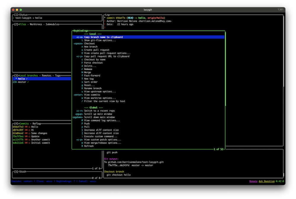 I can then easily bring up the keybindings panel for a branch and filter with ? to search through all the options.