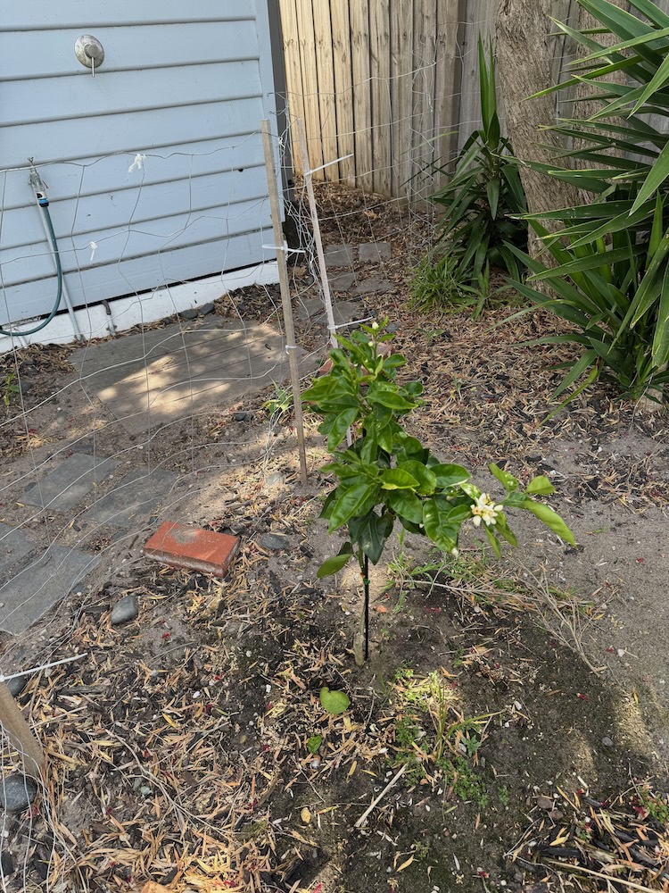 Orange tree: still a baby, has some flowers on it which is good
